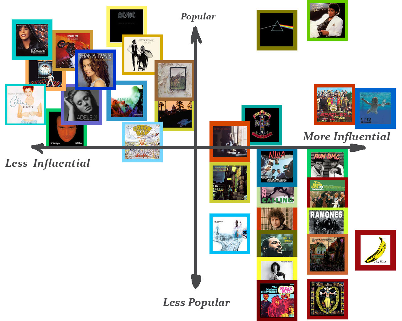 This matrix represents the most profitable and influential popular music albums of all time. The "X" axis represents how influential an album is considered to be. The "Y" axis represents total sales. The few albums that are BOTH popular and influential occupy a very privileged position. Note that the colored border around each album represents what year the album was introduced. The colors are red-shifted, that is, the more redder/brown the color is the older the album is. The more violet, the more recent the album is.