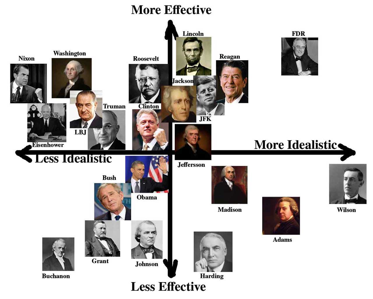 This matrix represents the most effective and idealistic US presidents. The "X" axis represents how idealistic a president is considered to be. The "Y" axis represents effectiveness. The few presidents that are BOTH effective and idealistic occupy a very privileged position.